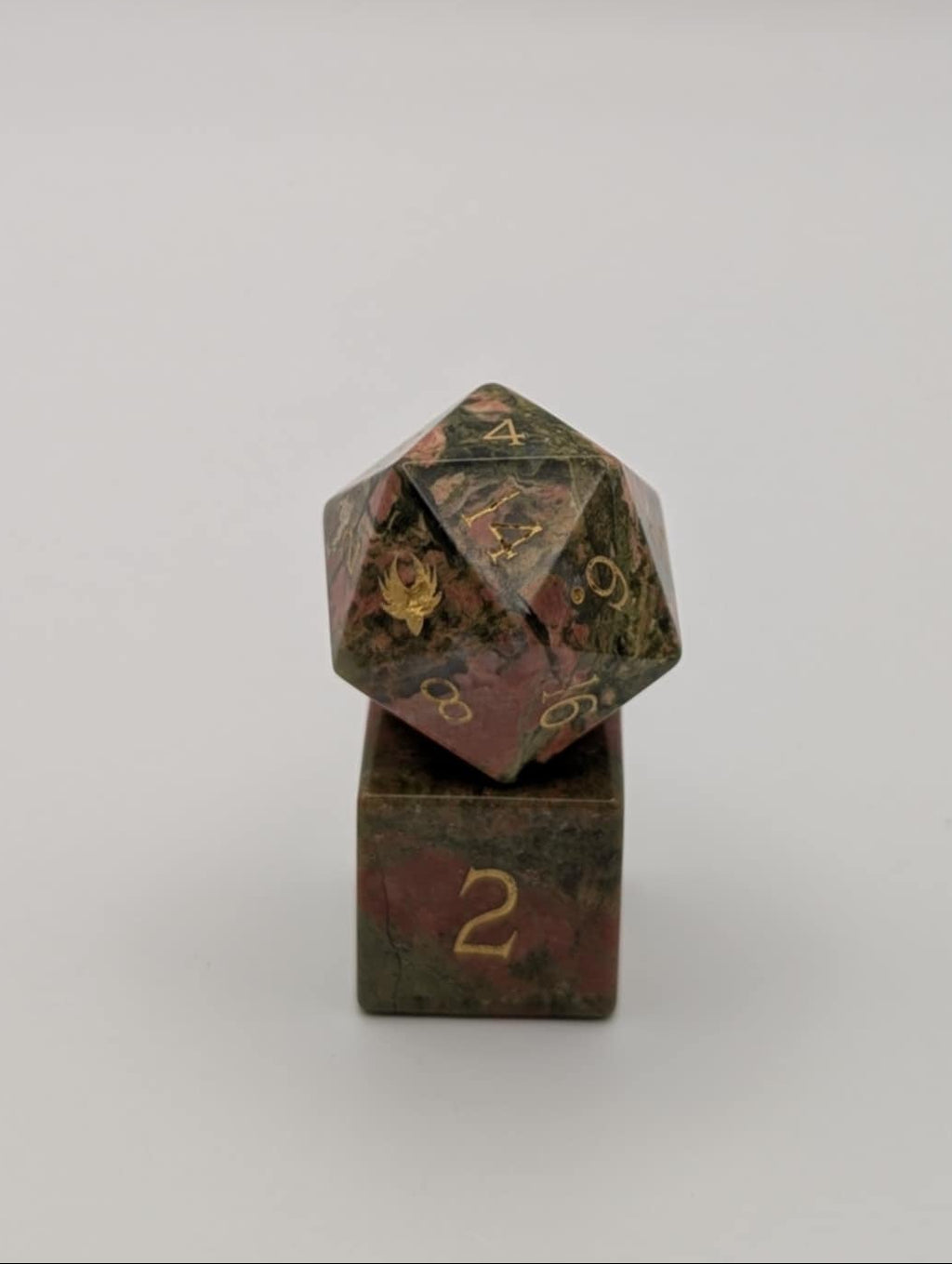 The Earthstone dice set is hewn from Unakite, a metamorphic rock, bringing out of this world battlefield grit to your DnD table. Each die is weighty in the hand, delivering a grounded, heavy roll that lands like a warhammer strike. Gold numerals flash like treasure in the roots, while natural mineral veining makes every set singular. Built for adventurers who trust granite over glamour: druids and rangers, mountain dwarves, oaths sworn understanding stones. Precision edges, polished faces, and balanced cores speak to craftsmanship—collector quality you can play hard. When initiative is called, let the earth answer. Earth stone doesn’t bounce; it settles, claiming its result with authority.