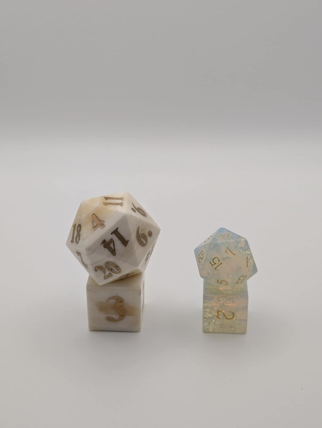 Carved from frost-pale bone and inlaid with quiet gilt numerals, Raven Queen’s Horde looks like it slipped from the Shadowfell at midnight—an heirloom of winter, memory, and fate. The facets catch the light like ice on feathered wings; hairline marrow veining gives each die the subtle, lived patina of a reliquary kept in cold chapels.