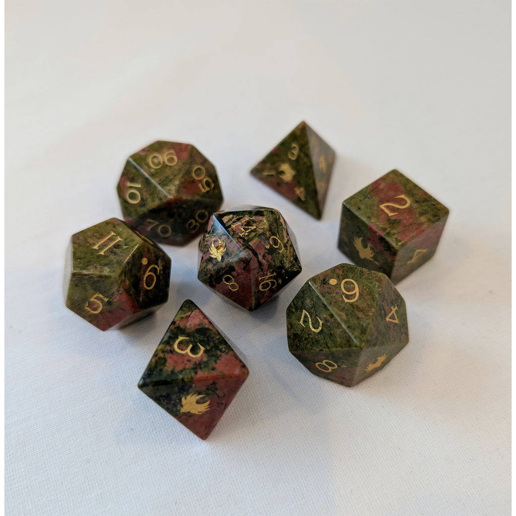 The Earthstone dice set is hewn from Unakite, a metamorphic rock, bringing out of this world battlefield grit to your DnD table. Each die is weighty in the hand, delivering a grounded, heavy roll that lands like a warhammer strike. Gold numerals flash like treasure in the roots, while natural mineral veining makes every set singular. Built for adventurers who trust granite over glamour: druids and rangers, mountain dwarves, oaths sworn understanding stones. Precision edges, polished faces, and balanced cores speak to craftsmanship—collector quality you can play hard. When initiative is called, let the earth answer. Earth stone doesn’t bounce; it settles, claiming its result with authority.