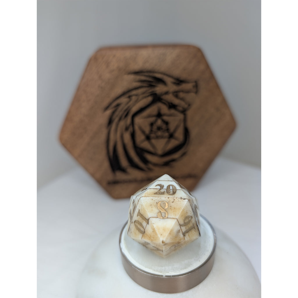 Cut from pale bone and washed in the quiet stain of ages, Myrkul’s Horde looks like it was lifted from a tyrant-king’s ossuary and crowned for play. The numerals gleam like grave-sigils—bronze inlay against ivory, each facet spidered with subtle marrow striations—so the die reads clearly without losing its relic feel.