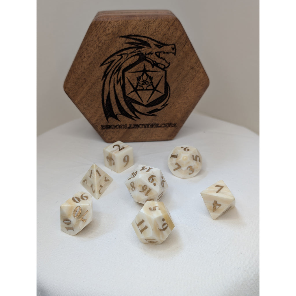 Carved from frost-pale bone and inlaid with quiet gilt numerals, Raven Queen’s Horde looks like it slipped from the Shadowfell at midnight—an heirloom of winter, memory, and fate. The facets catch the light like ice on feathered wings; hairline marrow veining gives each die the subtle, lived patina of a reliquary kept in cold chapels.