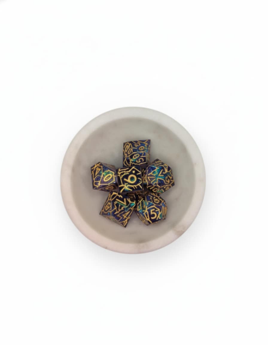 Shattered Tempest is a sharp-edge acrylic set cast in deep storm-violet, shot through with iridescent foils like lightning trapped in crystal, and inked in regal gold. Roll them and hear the gale rise—crisp edges, clean faces, and numerals that flare like runes in the heart of a thunderhead. Built for Tempest clerics, storm sorcerers, airship captains, and any hero who laughs at the wind. Whether you’re racing sky-krakens or calling down wrath, these dice cleave the chaos like a bolt through cloud. Initiative crackles, thunder answers; the storm remembers who you are. Stow them in your kit and claim the table as your Shattered Tempest.